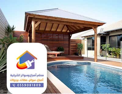 تركيب مظلة بألوان عصرية لتغطية بلاط الحوش بحيث يتم تقفيل هذه المنطقة واستخدامها كمنطقة للعب الأطفال أو استخدام المقاعد الخشبية وجعلها منطقة للجلوس والتجمعات. يمكنك استخدام المظلة الخشبية في حوش منزلك كوسيلة للتزيين وظهور حوش منزلك بشكل أنيق ومميز أمام الضيوف. نقوم بتركيب المظلات المنزلية لتغطية حمامات السباحة مع مراعاة توفير تشكيلات واسعة من ألوان المظلات لتناسب طلبات العملاء.